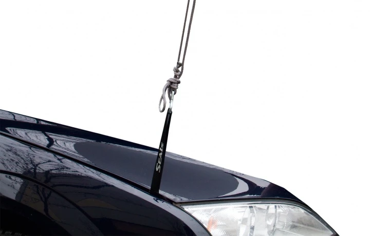 Einfach zu montierende Abspannschlaufen mit Öse, nur die Motorhaube öffnen, Abspannschlaufe an einer der Kotflügelschrauben montieren, fertig. Wenn die Abspannmöglichkeit nicht benötigt wird kann der Gurt einfach noch innen gelegt werden, muß also nicht demontiert werden.